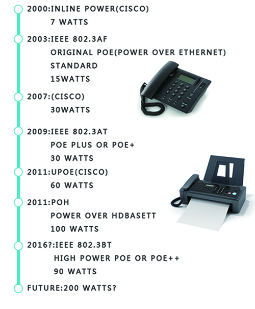 IEEE 802.3at標(biāo)準(zhǔn)2005年開始制定,2009年頒布。802.3at標(biāo)準(zhǔn)的輸出功率可達(dá)30W,受電端可用功率為25.5W。