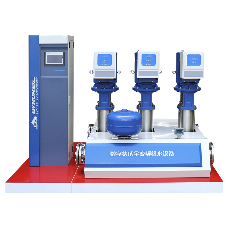數(shù)字集成全變頻給水設(shè)備中的每臺水泵均獨立配置數(shù)字集成水泵專用變頻控制器,各變頻控制器通過CAN總線技術(shù)相互通信、聯(lián)動控制、協(xié)調(diào)工作,可直接通過顯示屏進行人機對話,實現(xiàn)